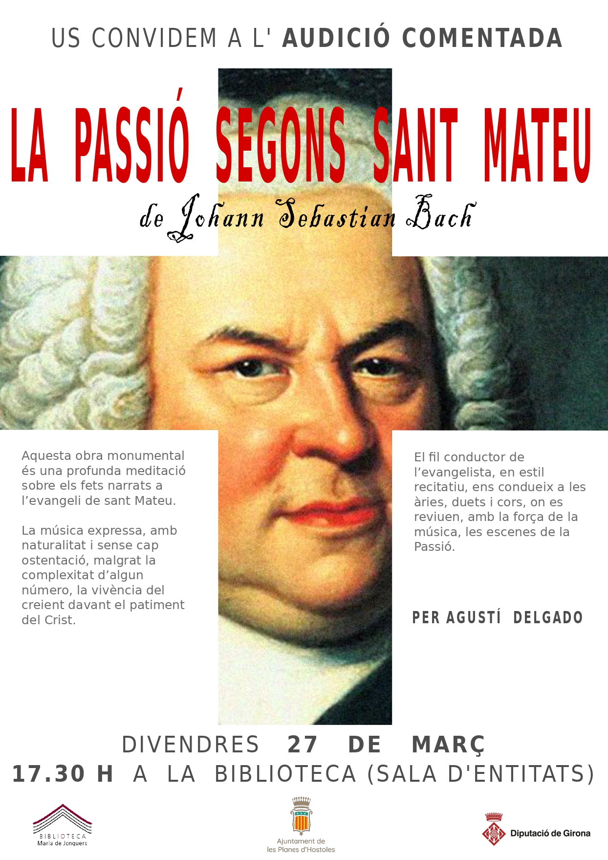Agustí Delgado ens parlarà d'aquesta obra monumental. Es tracta d'una profunda meditació sobre els fets narrats a l’evangeli de Sant Mateu. La música expressa amb naturalitat i sense cap ostentació, malgrat la complexitat d’algun número, la vivència del creient davant el patiment del Crist. El fil conductor de l’evangelista, en estil recitatiu, ens condueix a les àries, duets i cors, on es reviuen amb la força de la música les escenes de la Passió.