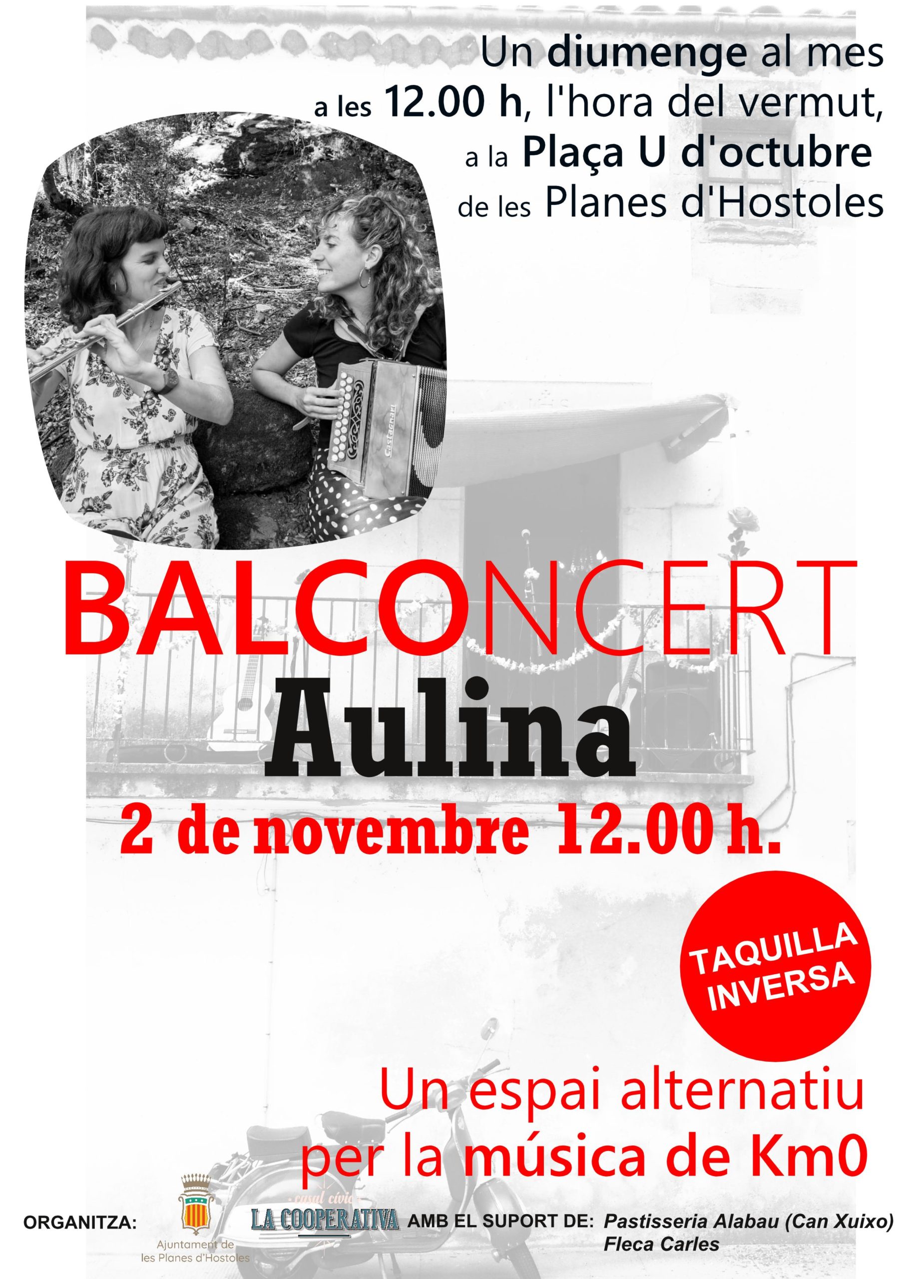 El BALCOncert, un espai alternatiu per la música de quilòmetre zero un dels primers diumenges de mes a l'hora del vermut, les 12 del migdia. En aquesta ocasió vindran les Aulina de la vall de Llémena a la plaça 1 d'octubre, per fer-nos dansar amb melodies folk.