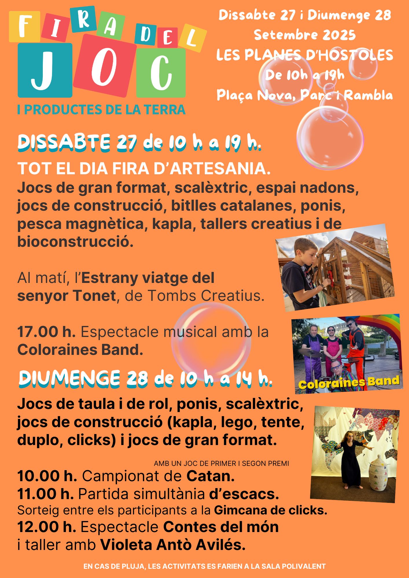 En la feria del Juego y Productos de la Tierra encontrará todo tipo de juegos y para todas las edades: juegos de ingenio, juegos de mesa, juegos de rol, juegos de gran formato, juegos para bebés, juegos que requieren cierta habilidad... La feria es un espacio entrañable con paradas de productos artesanos amenizada con espectáculos y talleres. Este año será el 27 y el 28 de septiembre, y se realizará en el entorno habitual de la Plaça Nova y el parque central. La feria se encuentra enmarcada en las Fiestas de Santa Espina, la fiesta chica del pueblo, que cuenta con diversas actividades.